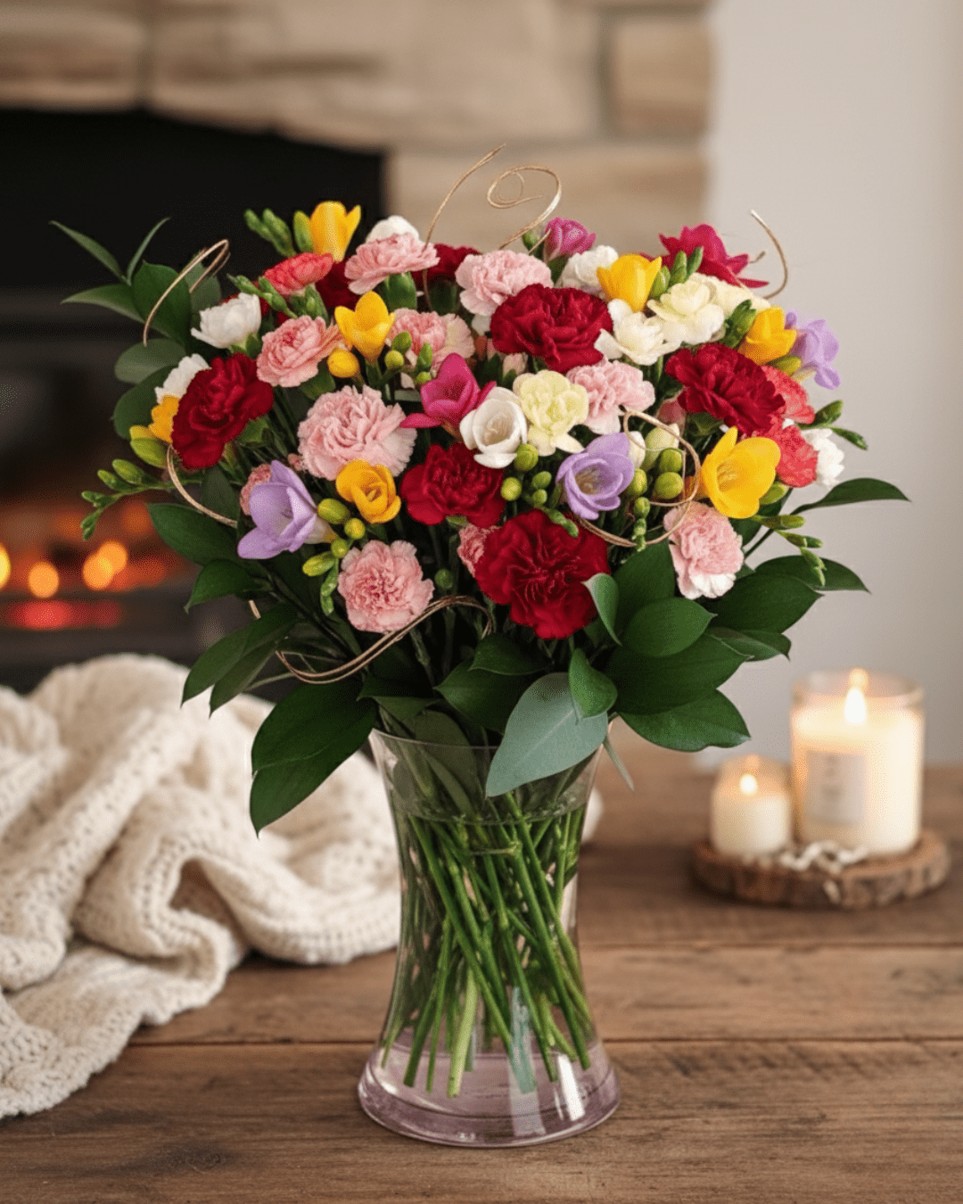 What to Expect: This beautifully fragrant bouquet features a delightful mix of colored spray carnations, known for their rich texture and long-lasting vase life. The true magic is the inclusion of sweet, highly aromatic Freesia, filling the air with a comforting scent. We complement this with structure from classic Ruscus and the modern, soothing fragrance of Eucalyptus. Finally, festive sparkle is added with delicate sprays of Golden Ting Ting.