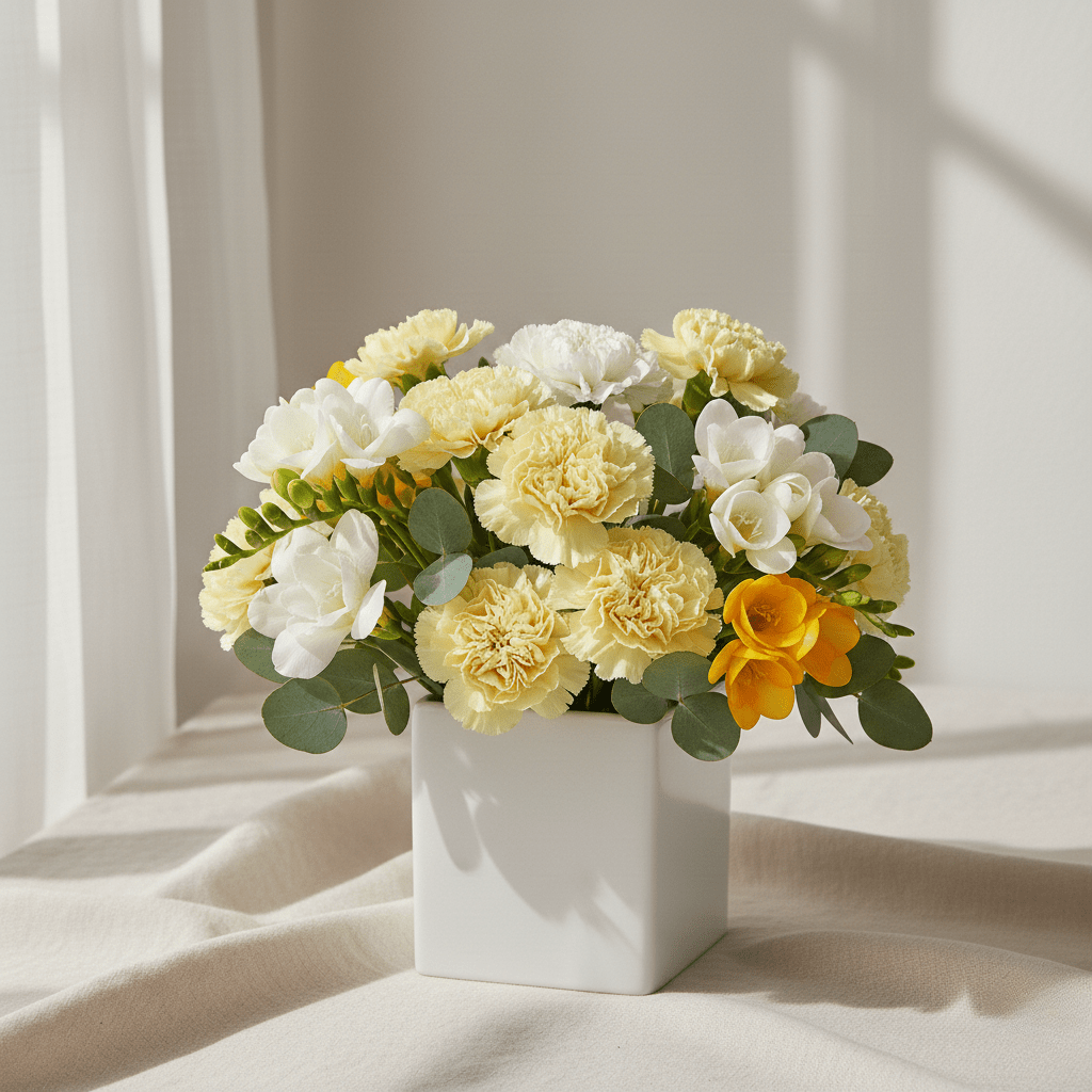 A traditional flower bouquet featuring two of our best-loved heirloom flowers, scented freesia and heirloom carnations, all grown in our nursery in Guernsey.