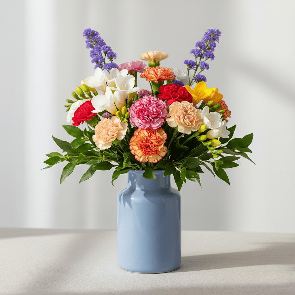 A traditional flower bouquet of beautiful heritage flowers including scented freesia and heirloom carnations all grown in our nursery in Guernsey.