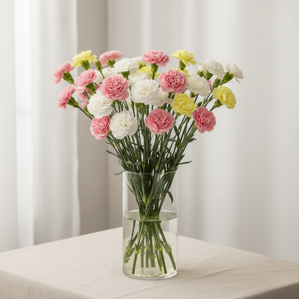When it comes to classic flowers carnations are hard to beat. Unlike their standard carnation cousins with one flower to each stem, the stems of spray carnations boast numerous smaller blooms. With the same long vase life, they are excellent value for money. Bouquets are completed with contrasting seasonal foliage.
